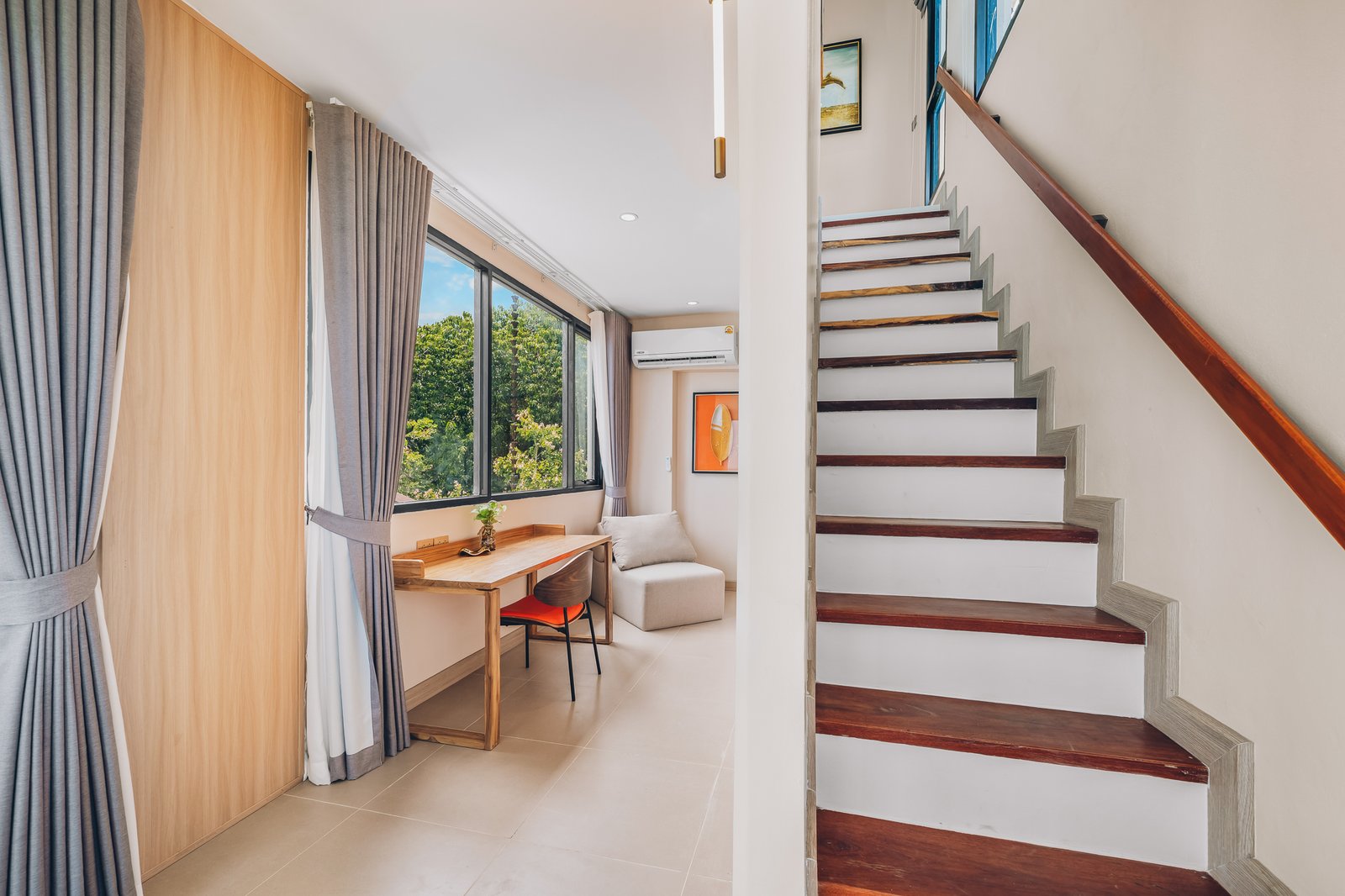 The upper level features a stunning, expansive bedroom with floor-to-ceiling windows that perfectly frame the mesmerizing sea view. Downstairs, a spacious living area provides a sophisticated space to relax.